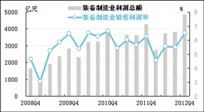 经初步季节调整,四季度装备制造业实现利润总额为4869.3亿元,同比增长13.9%,同比增速继三季度加快2.6个百分点之后,又比三季度加快了8.8个百分点。四季度装备制造业的销售利润率为6.5%,比三季度提升1个百分点。由于装备产品市场需求回暖态势基本确立,而产品原材料成本价格回升速度较慢,装备制造业经济效益增长有望保持良好或好中见快的趋势。