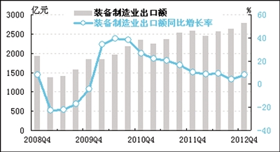 经初步季节调整,四季度我国装备制造业出口额为2788.3亿元,同比增长7.9%,增速比三季度回升3.7个百分点,主要受俄罗斯、东盟等新兴市场对装备产品需求快速增长的影响。装备制造业出口交货值占产品销售收入的比重为24.8%,比三季度回落0.4个百分点。