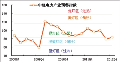 2012年四季度,中经电力产业景气指数为99.9,较上季度上升0.2点;中经电力产业预警指数为83.3,较上季度上升4.1点,由“浅蓝灯区”上升到“绿灯区”的下界线上。