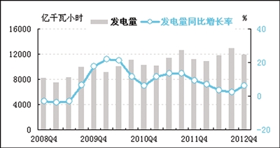 四季度,发电量同比增速在连续五个季度下滑后开始回升,主营业务收入平稳增长,行业利润总额、税金总额以及销售利润率均呈现一定程度的上升态势,固定资产投资增速在连续两个季度下降之后开始转为上升,用工需求持续减缓。预计2013年一季度,电力行业各指标将继续呈现趋稳态势。