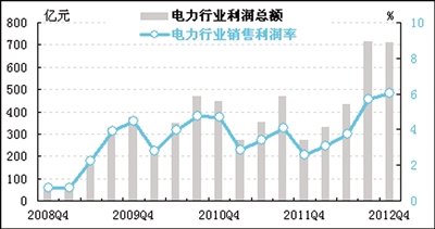 四季度电力行业销售利润率为6.1%,较上季度微升0.3个百分点,比全部工业6.5%的平均销售利润率低0.4个百分点。