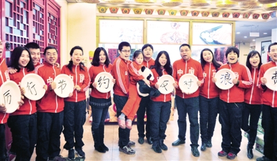 1月27日,志愿者手拿餐盘喊出“厉行节约,反对浪费”的口号。当日,“光盘行动”发起者们继续在多家餐厅开展“我光盘,我光荣”宣传活动。
