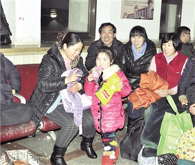 1月26日,在石家庄新客站候车大厅,一位小朋友和父亲一起候车。