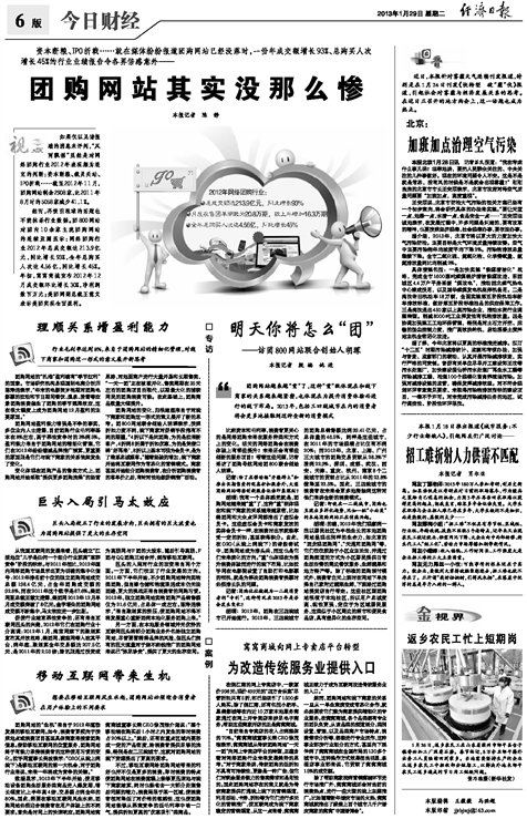 胡琛:2012年,团购在三四线城市已开始流行。2012年,三四线城市的团购总销售额达到99.41亿元,占总体量的46.5%,同样是这些城市,在2011年的市场规模占比仅有不到20%;而2012年,北京、上海、广州三大城市的团购交易贡献从28.3%下滑到22.9%,深圳、成都、武汉、西安、天津、重庆、杭州、南京8个二线城市的贡献占比从2011年的23.8%微降至22.5%。因此,三四线城市的消费者在未来会更多地接触到这种对他们来讲全新的消费模式。
