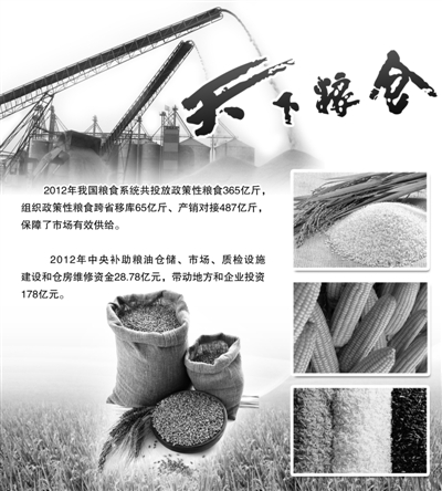 “保障‘种粮卖得出、吃粮买得到’是粮食流通工作的‘底线目标’,绝不允许发生农民‘卖粮难’、粮食供应脱销断档。”国家粮食局局长任正晓介绍,2012年以来,我国粮食系统综合利用政策性粮食竞价销售、储备粮油轮换、适时进口转储、组织跨省移库和产销衔接等手段,有效实施粮食宏观调控,全年共投放政策性粮食365亿斤,组织政策性粮食跨省移库65亿斤、产销对接487亿斤,保障了市场有效供给,维护了粮价基本稳定。