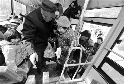 1月30日,在从宁夏固原市市区开往彭堡镇吴磨村的城乡公交车上,几位进城置办年货的乘客上车。