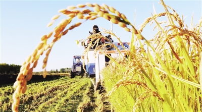 黑龙江省八五六农场水稻种植户在收获水稻。(资料图片)新华社发