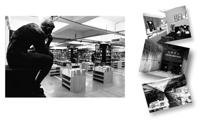 在轻音乐声中扫过满墙的讲座海报,走进这个爬满藤蔓的防空洞,看到桌上的思想者雕塑和用上万本书堆成的收银台,就这样开始一点点感受先锋书店的风骨。