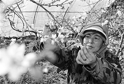 ② 1月31日,宁夏吴忠市勤海设施经果林协会的农户在大棚里查看果树授粉情况。 新华社记者 王 鹏摄