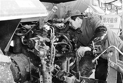 ③ 1月31日,安徽省宿州市淮海农机专业合作社的农机维修员王培勇在维修拖拉机上的液压装置。