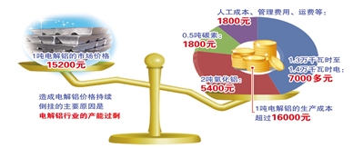 记者在占国内电解铝产能四分之一的河南调查了解到,目前一吨电解铝的市场价格约为15200元,而成本则超过16000元。受价格持续倒挂的影响,2012年全国有93%的电解铝企业处于亏损状态。