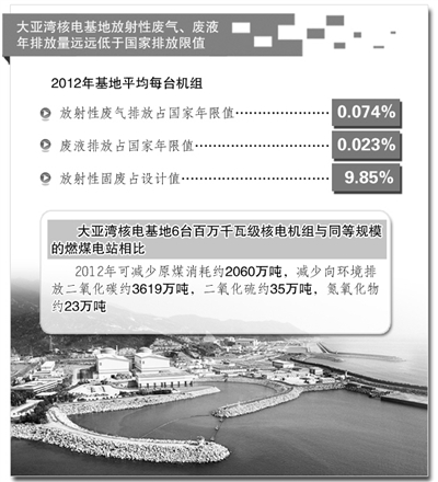据介绍,长期以来,大亚湾核电基地放射性废气、废液年排放量远远低于国家排放限值。2012年,大亚湾核电基地平均每台机组放射性废气、废液排放仅占国家年限值的0.074%和0.023%,放射性固废占设计值的9.85%。据香港环境监测站(点)的长期跟踪监测,核电站环境放射性水平与本底相比没有变化,区域内陆地、海洋生物种群数量没有发生变化。