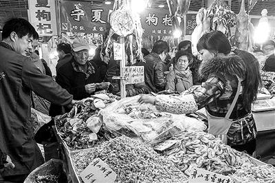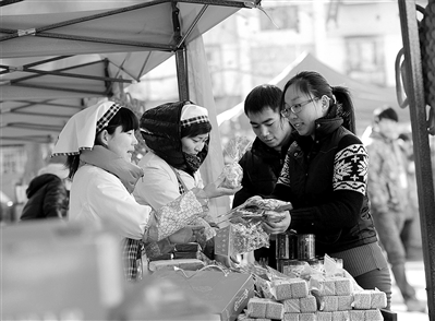 ①2月4日,市民在社区年货大集选购商品。当天,北京大兴区兴丰街道举行“年货进社区,门口赶大集”活动,将一些百姓需要的年货商品带进社区,过年气氛渐浓。 本报记者 赵 晶摄