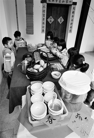 2月1日,小朋友在台北市万华区剥皮寮历史街区参观“年节客厅”。近日,台北市万华区剥皮寮历史街区举办“纸在太阳回来的路上”春节系列活动。 新华社发