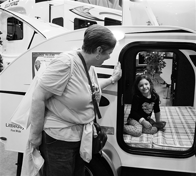 2月6日,在美国纽约休斯敦房车展上,一名小女孩钻进一辆名为“小家伙”的轻便型旅行拖车内体验。该车也是本届房车展上体积最小的一辆,重量仅900磅(约810斤)。当天,第49届休斯敦房车展在休斯敦市瑞拉特中心拉开帷幕,共展出约500款各类房车车型。为期5天的车展将于10日落幕,预计将吸引3万至3.5万人前来观展。