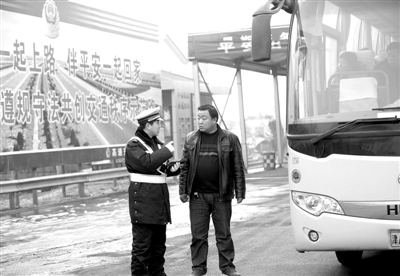 2月14日,京哈高速公路香河收费站,河北高速交警香河大队执勤民警孙华正在对大客车进行安全检查。春节假期即将结束,公路运输也将迎来返程高峰。河北高速交警坚守工作岗位,加大巡逻密度,全时段管控,确保辖区高速公路安全畅通。 本报记者 赵 晶摄