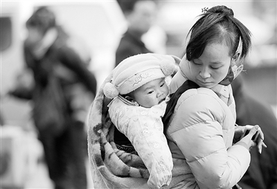 上图 2月15日,在广西桂林火车站前广场上,一名尚在襁褓中的婴儿随家长出行。 何平江摄(新华社发)