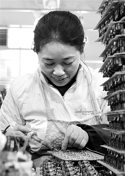 上图 2月18日,在江西省靖安县工业园区的江西合力照明电器有限公司,返乡农民工熊秀梅在检测集成电路板。