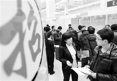右图 2月17日,在天津市由中国人力资源发展促进中心举办的春节后首场大型招聘会上,求职者了解应聘工作岗位。