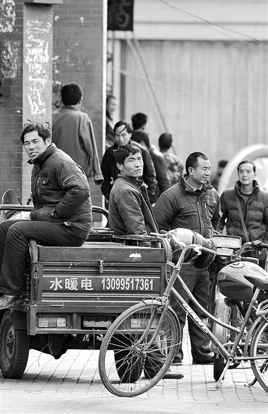 右下 2月18日,在宁夏银川市南门劳务市场外,几名务工人员在等待雇主。