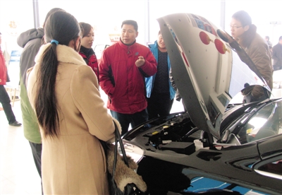 上图 2月18日,石家庄市北二环旁汽车城内,消费者在选购汽车。 本报记者 雷汉发摄