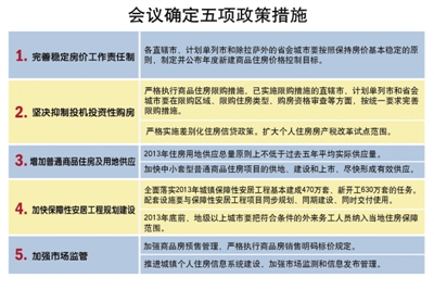 会议指出,近年来,各地区、各部门认真落实中央关于加强房地产市场调控的决策部署,取得积极成效,投机投资性购房得到有效抑制,房地产市场形势逐步平稳。住房限购、差别化住房信贷和税收、增加土地供应等综合性政策措施,对合理引导住房需求、缓解供求矛盾、稳定房价特别是遏制一些热点城市房价过快上涨,发挥了关键作用。