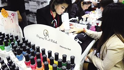 2月27日,在新加坡举行的亚洲美容美发展上,参展美甲师为参观者美甲。当天,亚洲美容美发展在新加坡滨海湾金沙会展中心举行。 新华社发