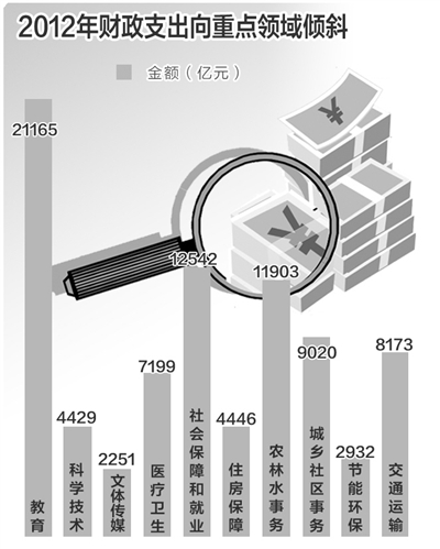今年的财政预算报告显示,2013年,对民生领域倾斜力度将继续扩大,对“三农”、教育、医疗卫生、社会保障等重点支出领域的财政保障力度将不断加大。2013年,中央财政用在与人民群众生活直接相关的教育、医疗卫生、社会保障和就业、保障性安居工程、文化方面的支出安排合计15712.5亿元,比上年预算数增长13.5%,比上年执行数增长9.6%;用在公共交通运输、节能环保、城乡社区事务等方面与人民群众生活密切相关的支出安排合计17150.03亿元。