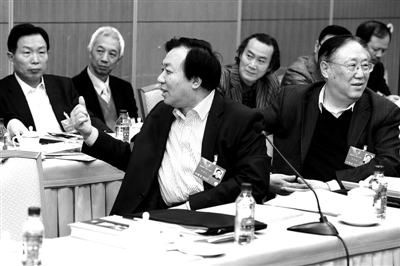 3月6日,政协文艺界委员小组讨论政府工作报告。何香久委员(前排左一)就大力发展文化产业发言。说到兴奋处,他转身与同组委员讨论起来。 本报记者 李树贵摄