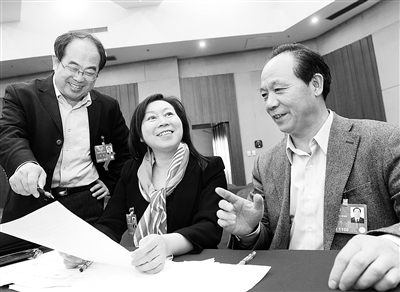 3月7日,政协科技界小组讨论政府工作报告。讨论结束后,徐金记委员(右)、王晶委员(中)和马力委员意犹未尽,继续就相关内容深入探讨。