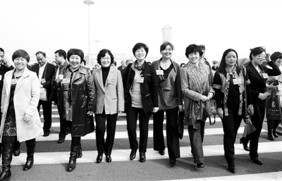 3月7日下午,全国政协十二届一次会议举行第二次全体会议,女委员们意气风发地步入会场。