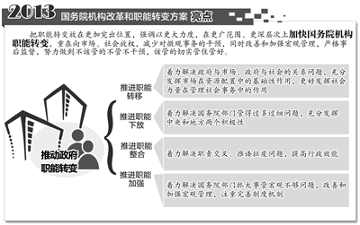 党的十八大提出要推动政府职能向创造良好发展环境、提供优质公共服务和维护社会公平正义转变。按照这一总方向,这次国务院机构职能转变突出了四个重点:一是推进职能转移,着力解决政府与市场、政府与社会的关系问题,充分发挥市场在资源配置中的基础性作用,更好发挥社会力量在管理社会事务中的作用。二是推进职能下放,着力解决国务院部门管得过多过细问题,充分发挥中央和地方两个积极性。三是推进职能整合,着力解决职责交叉、推诿扯皮问题,提高行政效能。四是推进职能加强,着力解决国务院部门抓大事管宏观不够问题,改善和加强宏观管理,注重完善制度机制。通过推动职能转变,加快形成权界清晰、分工合理、责权一致、运转高效、法治保障的国务院机构职能体系,真正做到该管的管住管好,不该管的不管不干预,切实提高政府管理科学化水平。