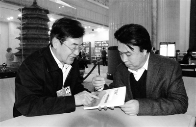人大福建团代表李川(左)在会议间隙与清华大学教授、博士生导师解安交流三农工作机制问题,深入探讨新形势下“三农”工作的新思路。
