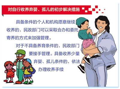 李立国说,自行收养的行为怎样纳入法律支持的范围,怎样有利于弃婴、孤儿的健康成长,是现在面临的社会管理和服务课题。今年1月份以来,民政部门对个人和民间机构自行收养弃婴、孤儿的情况进行了排查,研究了初步的解决措施。对于具备条件的个人和机构愿意继续收养的,民政部门可以采取合办和委托寄养的方式来加强管理和服务。对于不具备养育条件的,民政部门要接手管理。具备收养少量弃婴、孤儿条件的,鼓励并且提供服务,依法办理收养手续。