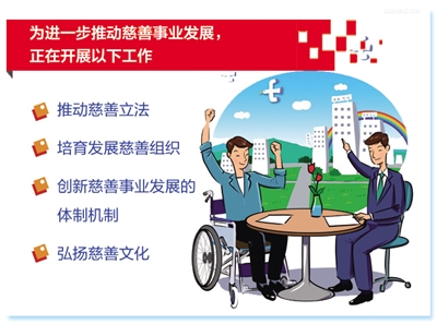 窦玉沛介绍说,为进一步推动慈善事业发展,正在开展以下工作:第一,推动慈善立法。全国人大在2008年将其列入立法计划。为加快解决当前存在的一些问题,民政部报请国务院,争取出台一个规范性文件,用行政手段来解决当前慈善事业存在的问题。第二,培育发展慈善组织。将成立中国慈善联合会,起到协调、互动、行业自律、行业维权的作用。第三,创新慈善事业发展的体制机制。第四,弘扬慈善文化。