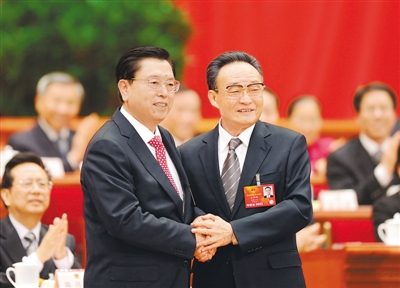 3月14日,十二届全国人大一次会议在北京人民大会堂举行第四次全体会议。张德江当选第十二届全国人民代表大会常务委员会委员长。这是张德江当选后,吴邦国与张德江亲切握手。