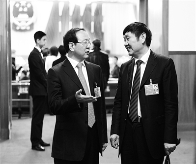 在会议现场,人大河南代表团刘卫星代表(左一)和刘国庆代表就积极稳妥推动城镇化健康发展话题交流想法。 本报记者 李景录摄