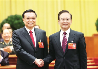 三月十五日,十二届全国人大一次会议在北京人民大会堂举行第五次全体会议。会议经过投票表决,决定李克强为中华人民共和国国务院总理。这是温家宝和李克强亲切握手。