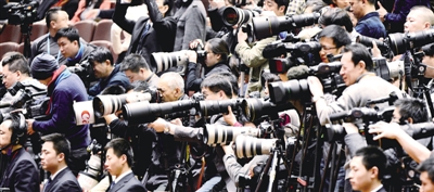 三月十六日下午,十二届全国人大一次会议举行第六次全体会议,吸引众多中外记者聚焦。 本报记者 李景录摄