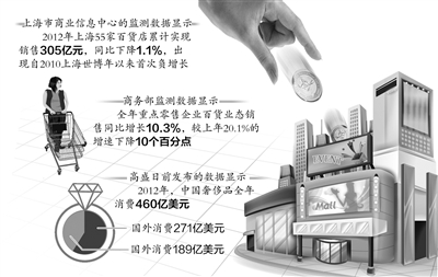 上海市商业信息中心的监测数据显示,2012年上海55家百货店累计实现销售305亿元,同比下降1.1%,出现自2010上海世博年以来首次负增长。