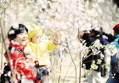 3月22日,游客在北京玉渊潭公园欣赏早樱。以“花开盛世 樱红探春”为主题的第二十五届北京玉渊潭公园樱花节23日开幕。公园内20多个品种的近2000株樱花含苞待放,迎接游客。 本报记者 赵 晶摄