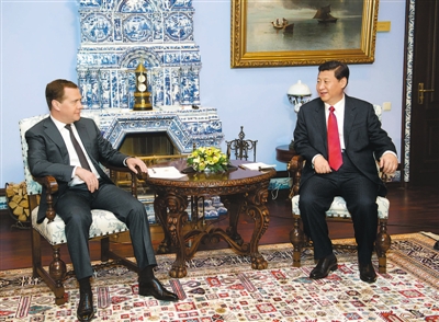 梅德韦杰夫表示,俄中全面战略协作伙伴关系发展良好,当前两国关系处于历史最好时期,俄方对此表示满意。俄方认为,习近平主席的访问成果丰硕,必将深化两国战略协作,为俄中关系长期发展注入新的动力。俄方将同中方一起努力,积极发挥两国总理定期会晤机制作用,全面落实两国元首达成的重要共识和协议,推动双边贸易加快增长,加强产业合作,增强各自经济实力。