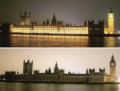 这是3月23日晚在英国首都伦敦拍摄的议会大厦熄灯前(上)和熄灯后的拼版照片。当地时间23日20时30分,伦敦参与由世界自然基金会发起的“地球一小时”活动,关闭主要景观照明一小时,以宣传节能环保的理念。 (新华社发)