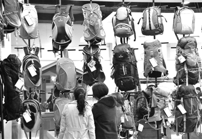 3月21日,在第6届中国(杭州)国际花园、户外家具及休闲用品展览会上,参观者在查看各式户外背包。第6届中国(杭州)国际花园、户外家具及休闲用品展览会于3月21日至24日在杭州国际和平会展中心举行,来自海内外168家参展商展示了户外家具、花园装饰用品、户外露营及运动装备等。 朱引炜摄(新华社发)