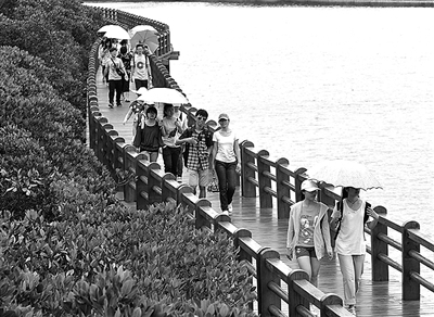 3月23日,游客在海口市东寨港水上栈道示范段散步游览。近日,全长1.1公里的海口市东寨港水上栈道示范段向游客开放,预计在“五一”国际劳动节前夕正式向游客开放总长8公里的全部栈道。 蒙钟德摄(新华社发)