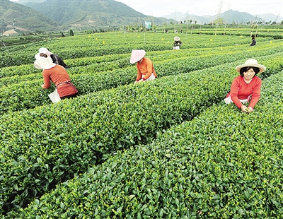 3月27日,茶农在浙江松阳茶山采春茶。据浙南茶叶市场绿茶价格指数显示,今年2月份,该市场茶叶交易量426吨,交易额19682万元,分别为去年同期的3.16倍和8.87倍。 新华社记者 王小川摄