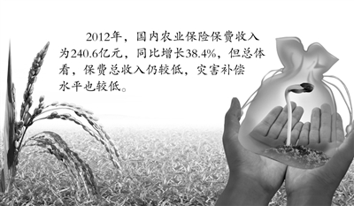 自2007年中央财政开始实施农业保险保费补贴政策以来,补贴品种逐年增加,比例逐年提高。当前我国每个产粮大省都有2家以上农业保险经营机构,也仅能初步满足农业保险发展的需要。长期以来,农民保险意识不高、种植规模化程度低、保险公司投入相对不足成为阻碍农业保险发展的制约因素。2012年,国内农业保险保费收入为240.6亿元,同比增长38.4%,但总体看,保费总收入仍较低,灾害补偿水平也较低。