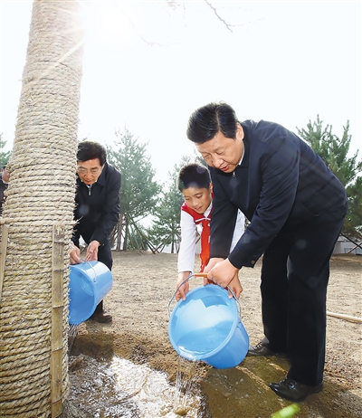 习近平刚下车,就拿起铁锹,同北京市、国家林业局的负责同志和少先队员开始植树。总书记走到一棵银杏树旁,挥锹铲土填入坑中,随后培实新土、堆起围堰、提桶浇水,道道工序都做得一丝不苟。习近平接连种下一棵白皮松、一棵西府海棠、一棵榆叶梅和一棵碧桃树。每种下一株树苗,习近平都和少先队员一道提桶浇水,还亲切询问孩子们的学习生活情况,希望少先队员们从小培养爱绿植绿护绿意识、生态环保意识、节约节俭意识。他说,身体是人生一切奋斗成功的本钱,少年儿童要注意加强体育锻炼,家庭、学校、社会都要为少年儿童增强体魄创造条件,让他们像小树那样健康成长,长大后成为建设祖国的栋梁之才。