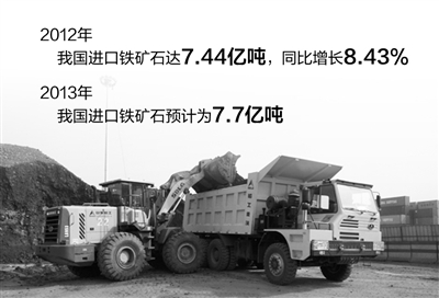 点评:近日,中钢协常务副秘书长、中国冶金工业规划研究院院长李新创在相关论坛上表示,2012年全年,我国进口铁矿石达7.44亿吨,同比增长8.43%,铁矿石的对外依存度已超七成。2013年我国铁矿石需求量预计将达到11.4亿吨,进口铁矿石将达7.7亿吨。