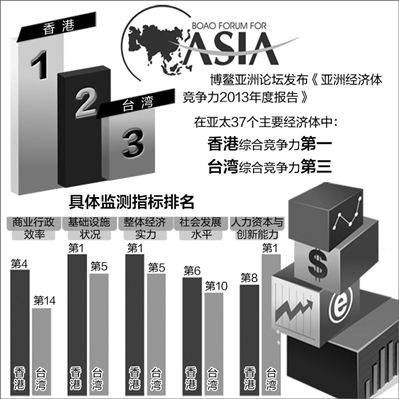 本报讯 记者周剑报道:博鳌亚洲论坛3月26日发布亚洲经济体竞争力2013年度报告,香港在亚太37个主要经济体中,整体排名由去年的第三升至第一。